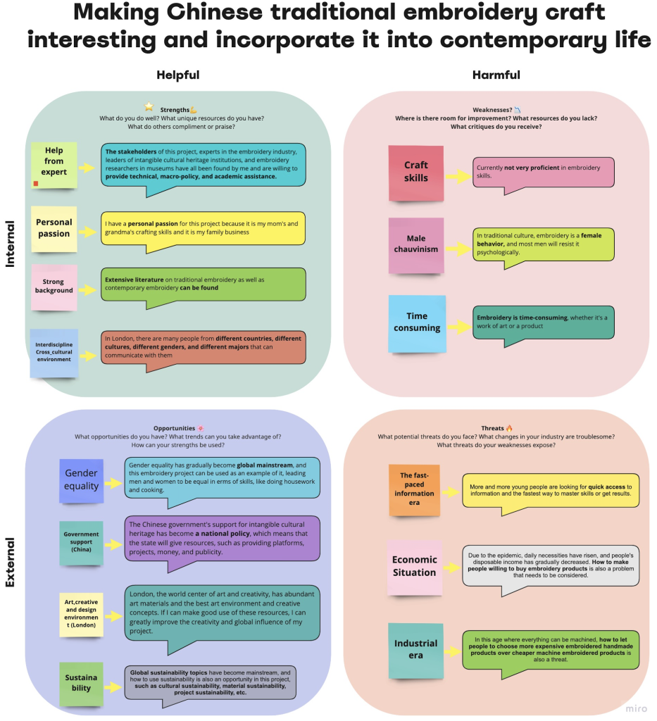 Through this action research, I have benefited a lot, because the interviewers have different job positions, but there are certain similarities in some aspects, such as the difficulties faced by traditional Chinese embroidery and the problems they want to solve, but they also have similarities. According to my social position, I have different opinions, and what they say is a real problem. I am trying to find a way to absorb this information and try to combine this information to find a breakthrough for my own project.